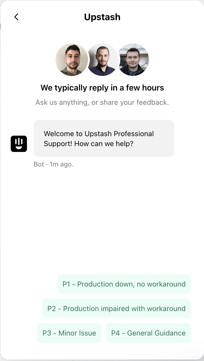You will see a chatbox on the bottom right when viewing Upstash console, docs and website. Once you initiate a chat, Professional Support customers will be prompted to select a severity level: