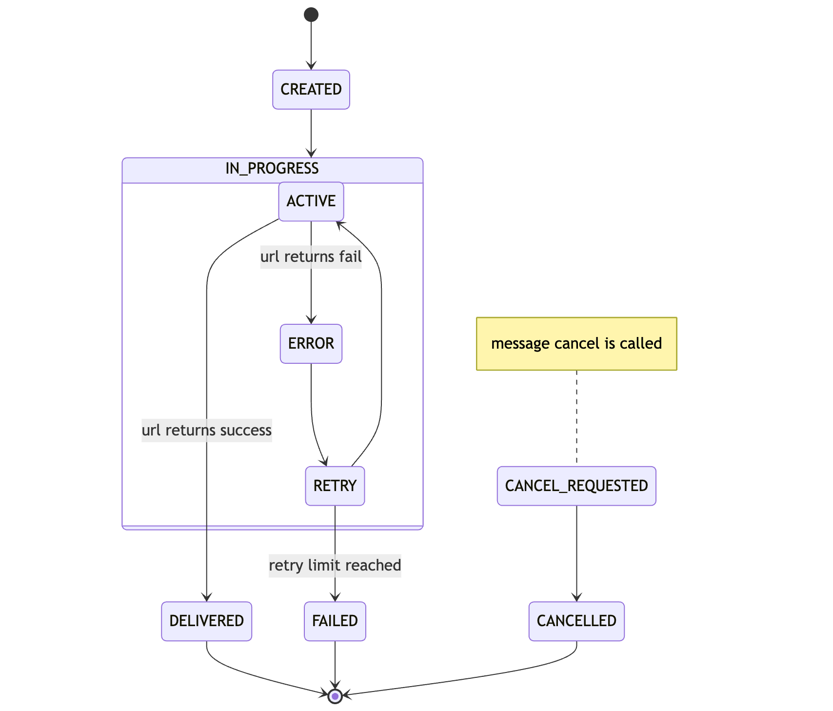 Either you or a previously setup schedule will create a message. When a message is ready for execution, it will be become ACTIVE and a delivery to your API is attempted. If you API responds with a status code between 200 - 299, the task is considered successful and will be marked as DELIVERED. Otherwise the message is being retried if there are any retries left and moves to RETRY. If all retries are exhausted, the task has FAILED and the message will be moved to the DLQ. During all this a message can be cancelled via DELETE /v2/messages/:messageId. When the request is received, CANCEL_REQUESTED will be logged first. If retries are not exhausted yet, in the next deliver time, the message will be marked as CANCELLED and will be completely removed from the system.