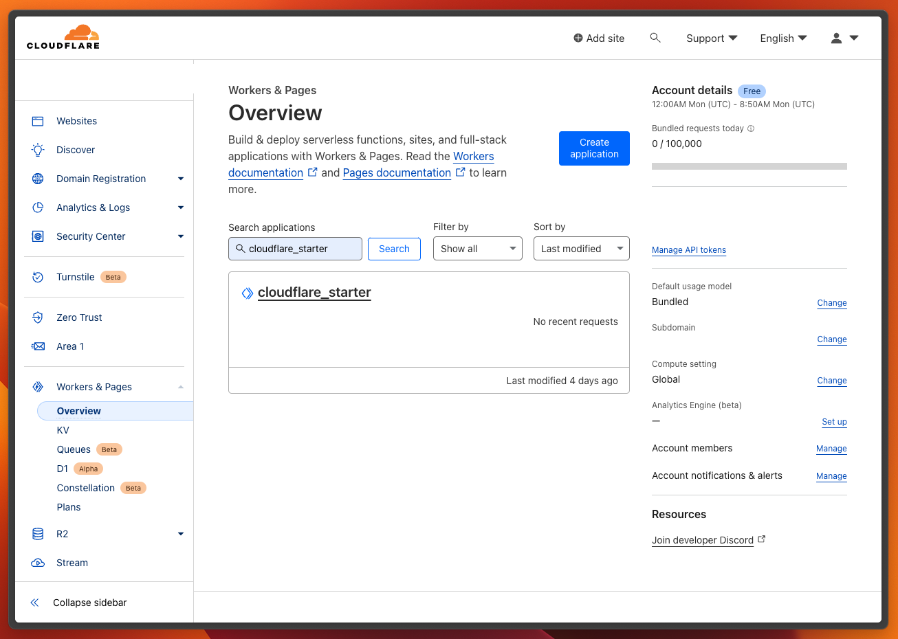 Access to the Cloudflare Dashboard and login with the same account that you’ve used while setting up the Worker application. Then, navigate to Workers & Pages > Overview section on the sidebar. Here, you’ll find your application listed.