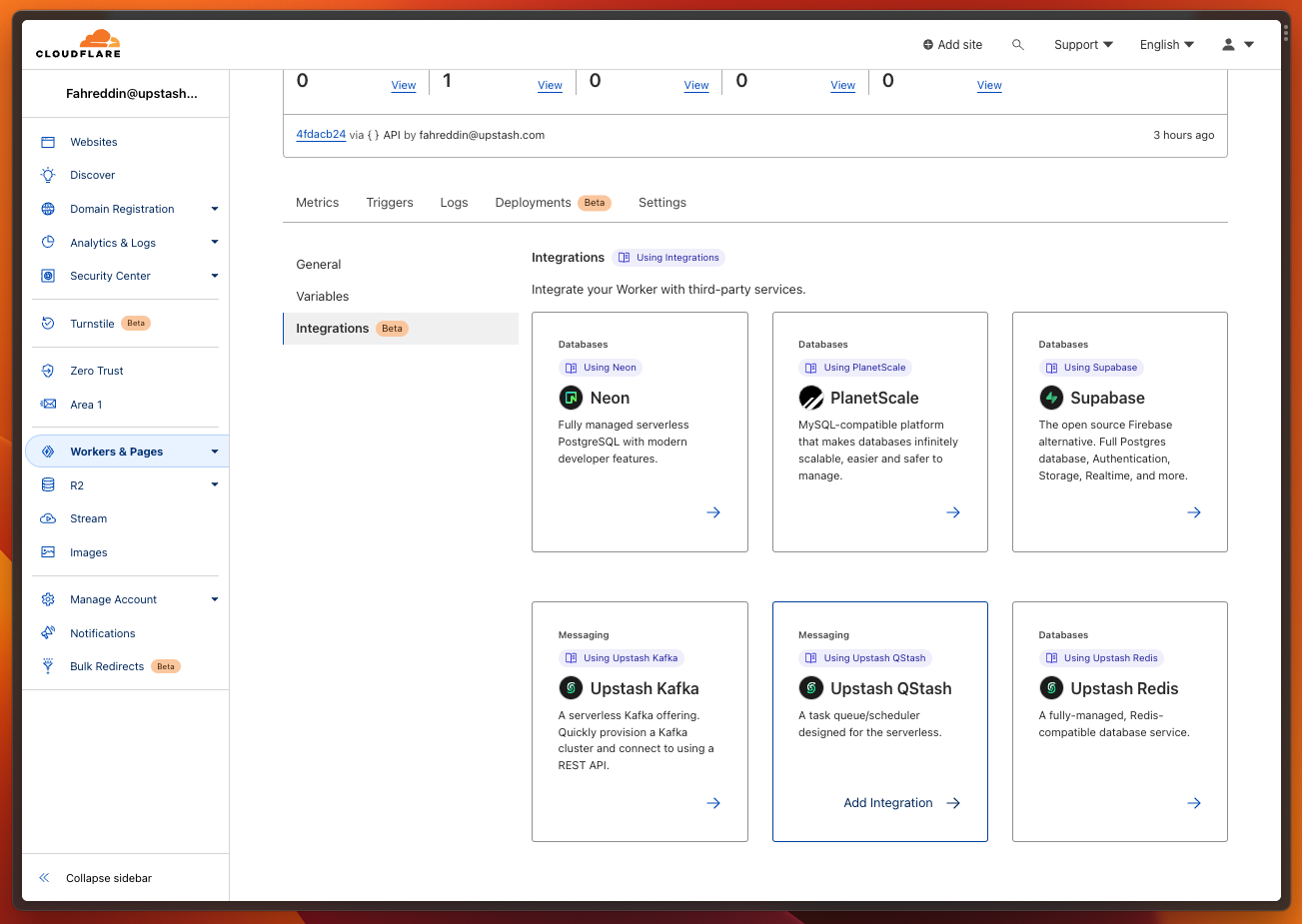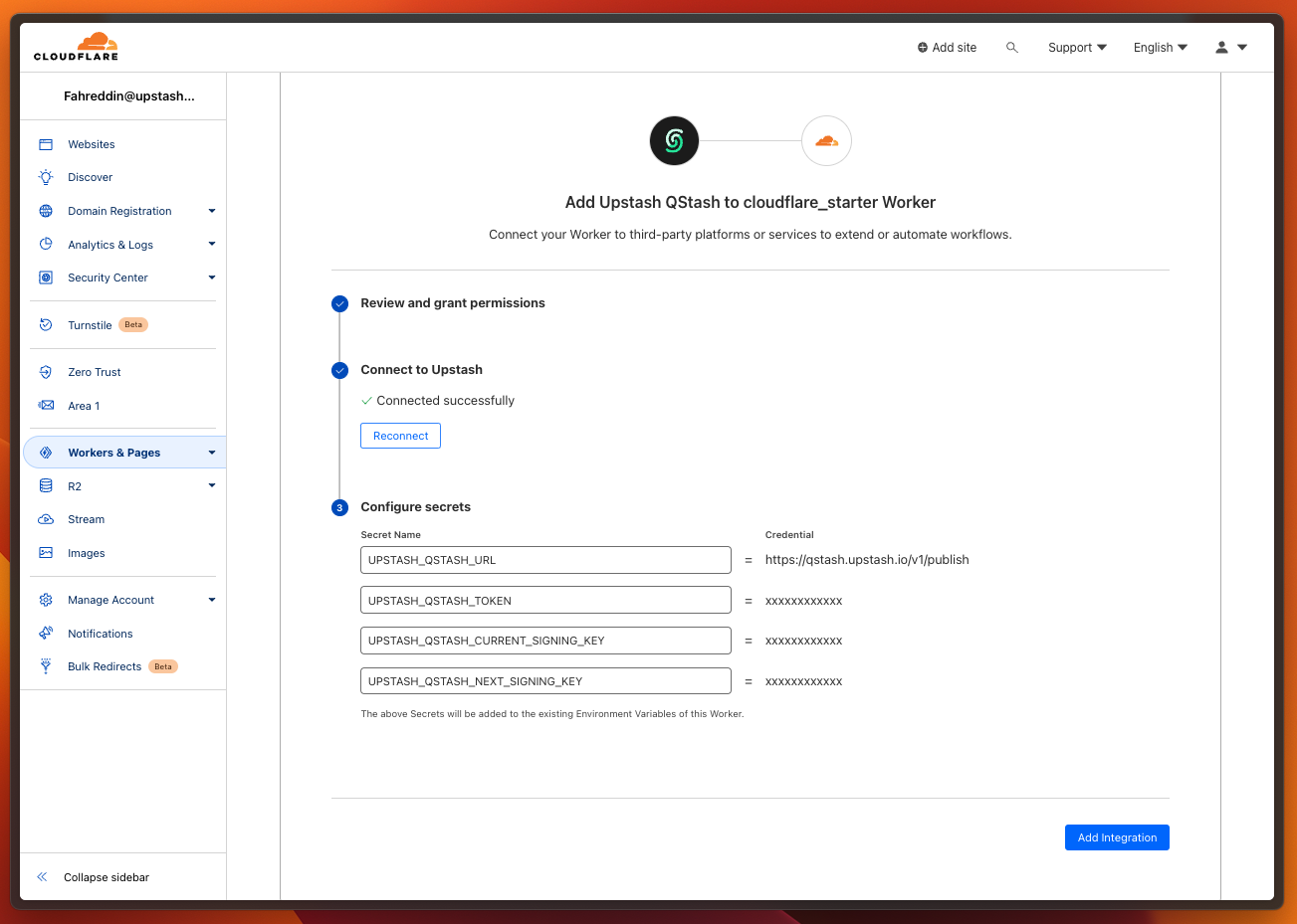 There are two methods for setting up the credentials for QStash. The recommended way is to use Cloudflare Upstash Integration. Alternatively, you can add the credentials manually.Using the Cloudflare Integration