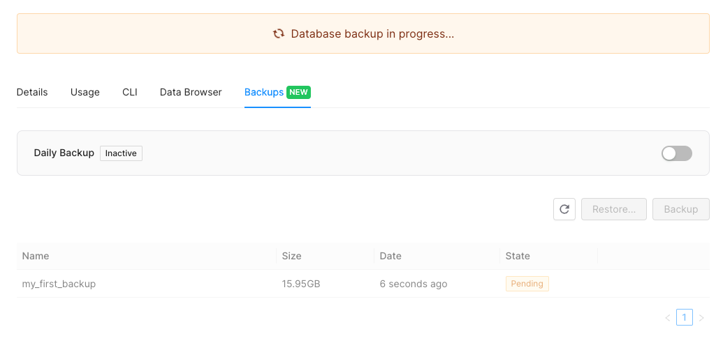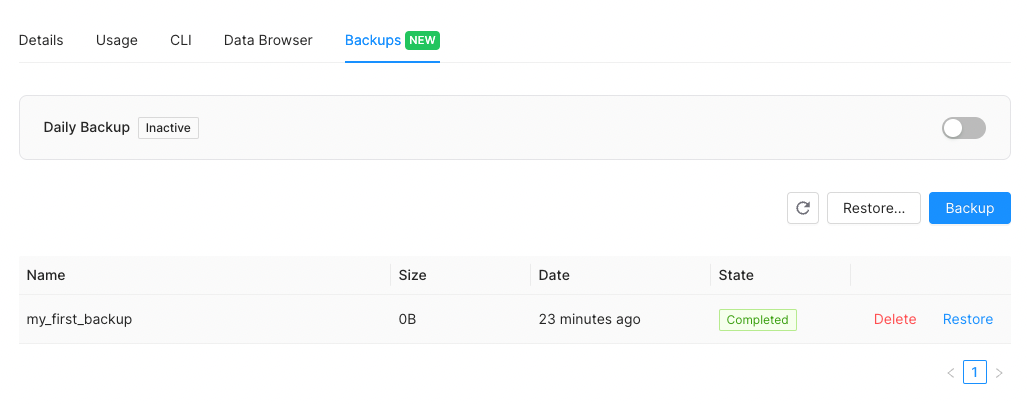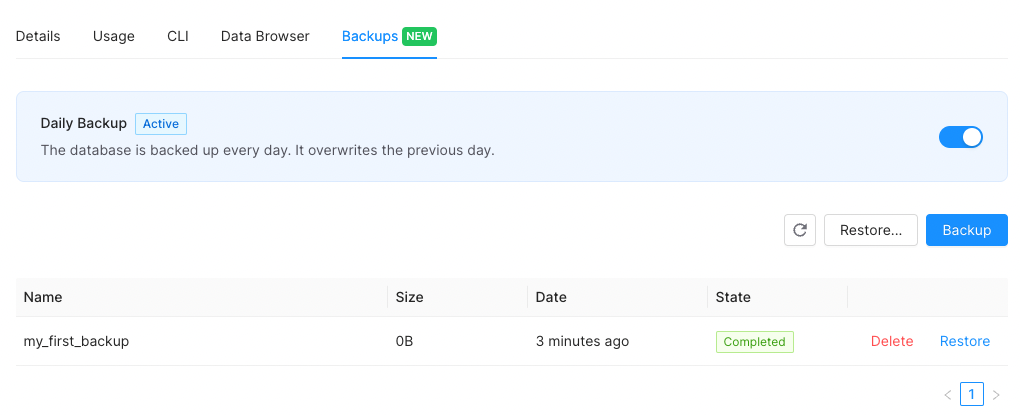 You can create a manual backup of your database and restore that backup to any of your databases. Both backup and restore operations require that your database is in one of the AWS regions. Additionally, you can utilize the daily backup feature to automatically create backups of your database on a daily basis.