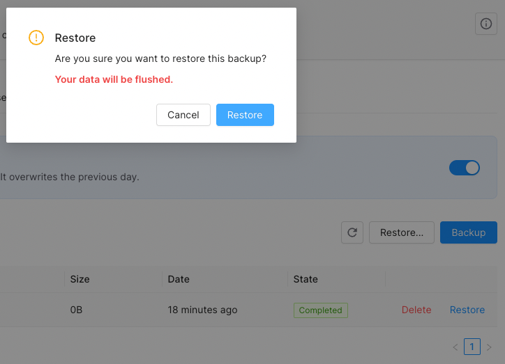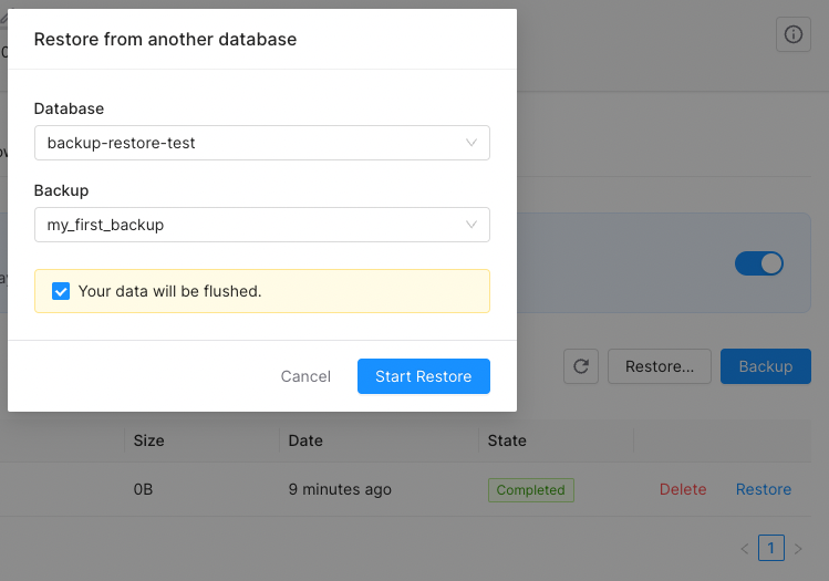 • Click on Start Restore. Be aware of the fact that your target database will be flushed with this operation.