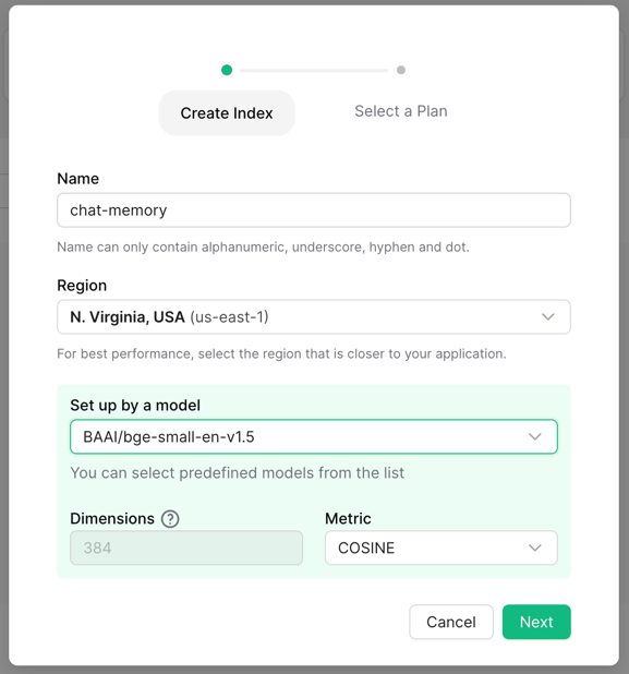 To start using embedding models, create the index with a model of your choice.