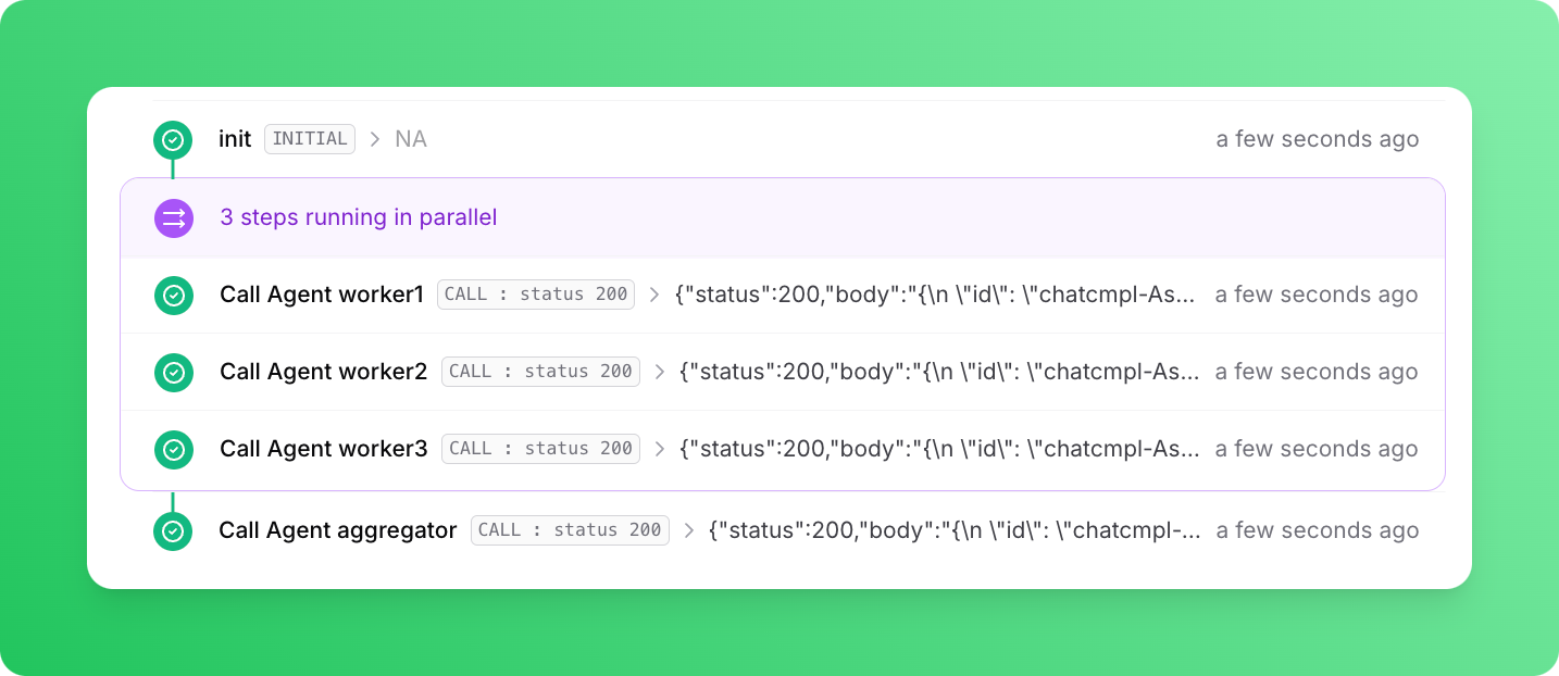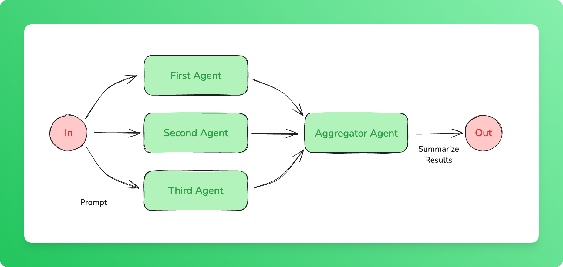 This workflow calls multiple agents simultaneously to handle tasks, and then aggregates their results.