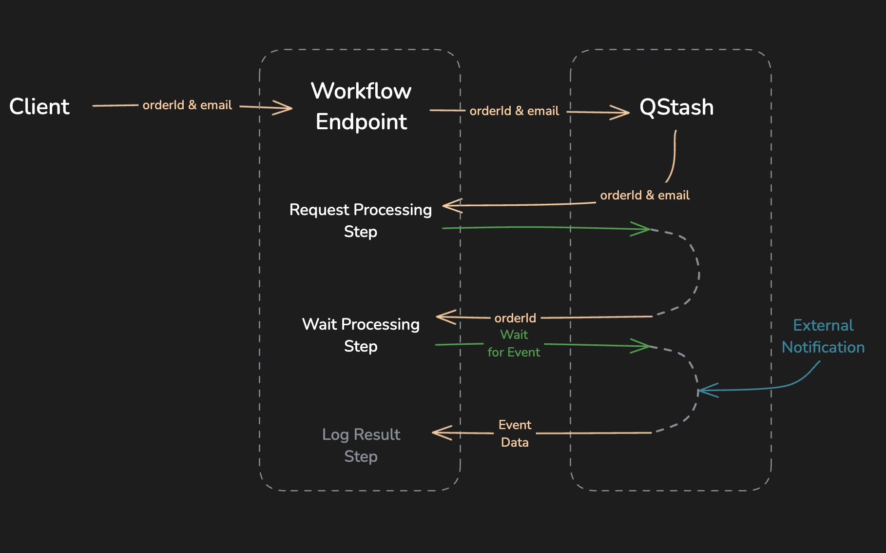 - Asynchronous Event Handling: The workflow waits for an external event (order processing) to occur and only resumes once the event is received.