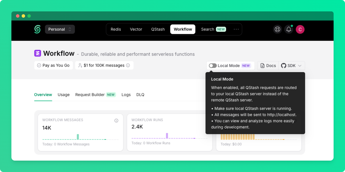Once you start the local server, you can go to the Workflow tab on Upstash Console and enable local mode, which will allow you to monitor and debug workflow runs with the local server.