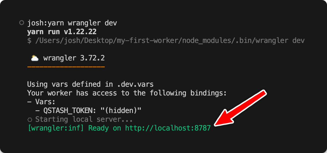 Executing this command prints a local URL to your workflow endpoint. By default, this URL is http://localhost:8787. You can verify your correct environment variable setup by checking the wrangler output, which should now have access to your QSTASH_TOKEN binding and log your local URL: