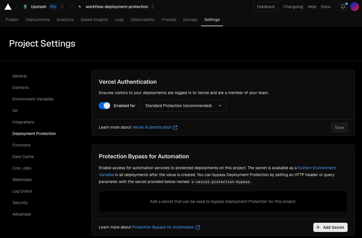 Problem: When Deployment Protection setting is enabled on Vercel, it’s not possible to trigger and complete a workflow run on a preview deployment. Solution: Vercel provides a way to bypass this protection by using a bypass secret. To create one, follow these steps:1